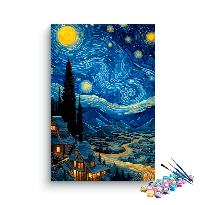 Starry Mountain Village: Van Gogh-Inspired Nightscape Paint by Numbers Kit