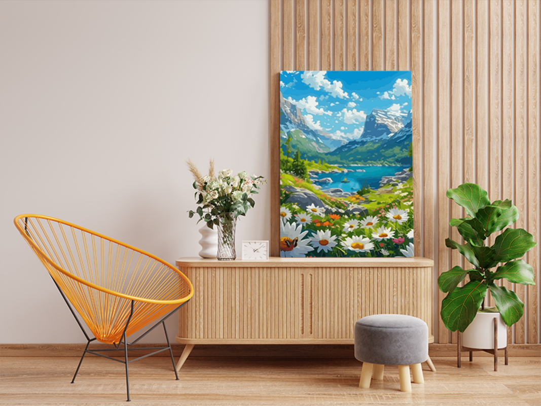 Bring the vibrant beauty of an alpine meadow to life with this Alpine Daisy Meadow paint by numbers kit. Featuring a stunning view of snow-capped mountains, a crystal-clear lake, and a field bursting with daisies and wildflowers, this artwork is a celebration of nature’s splendor. Perfect for artists of all skill levels, this kit offers a relaxing and rewarding painting experience. Add a touch of natural beauty to your space or gift this peaceful scene to a loved oneβ€”it’s sure to inspire joy and creativity.