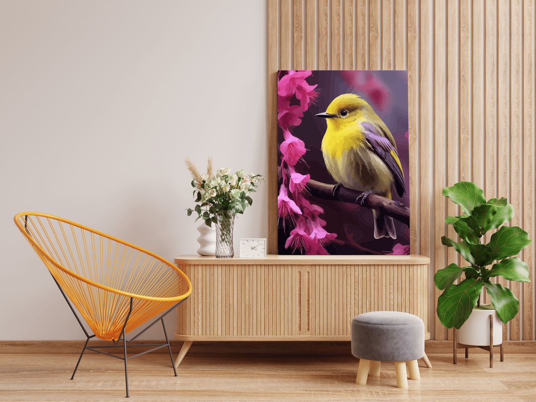 Add a splash of vibrant color to your home with our ‘Bright Bird and Blossoms’ Paint by Number Kit. This beautiful artwork showcases a radiant yellow bird perched on a branch adorned with delicate pink blossoms. The striking contrast between the bird’s bright feathers and the soft hues of the flowers creates a captivating scene that exudes joy and serenity.