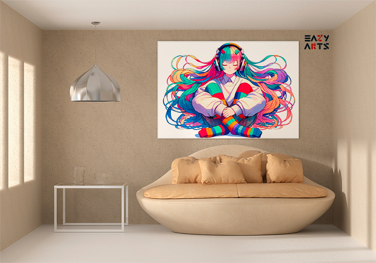 Immerse yourself in a world of color and calm with our Dreamy Rainbow Girl Listening to Music Painting Kit. This vibrant artwork features a serene anime-style girl with flowing multicolor hair, cozy rainbow-striped socks, and oversized headphones, capturing the perfect blend of relaxation and imagination. Ideal for music lovers and fans of anime art, this paint-by-numbers kit makes a bold, colorful statement on any wall and offers a soothing painting experience.
