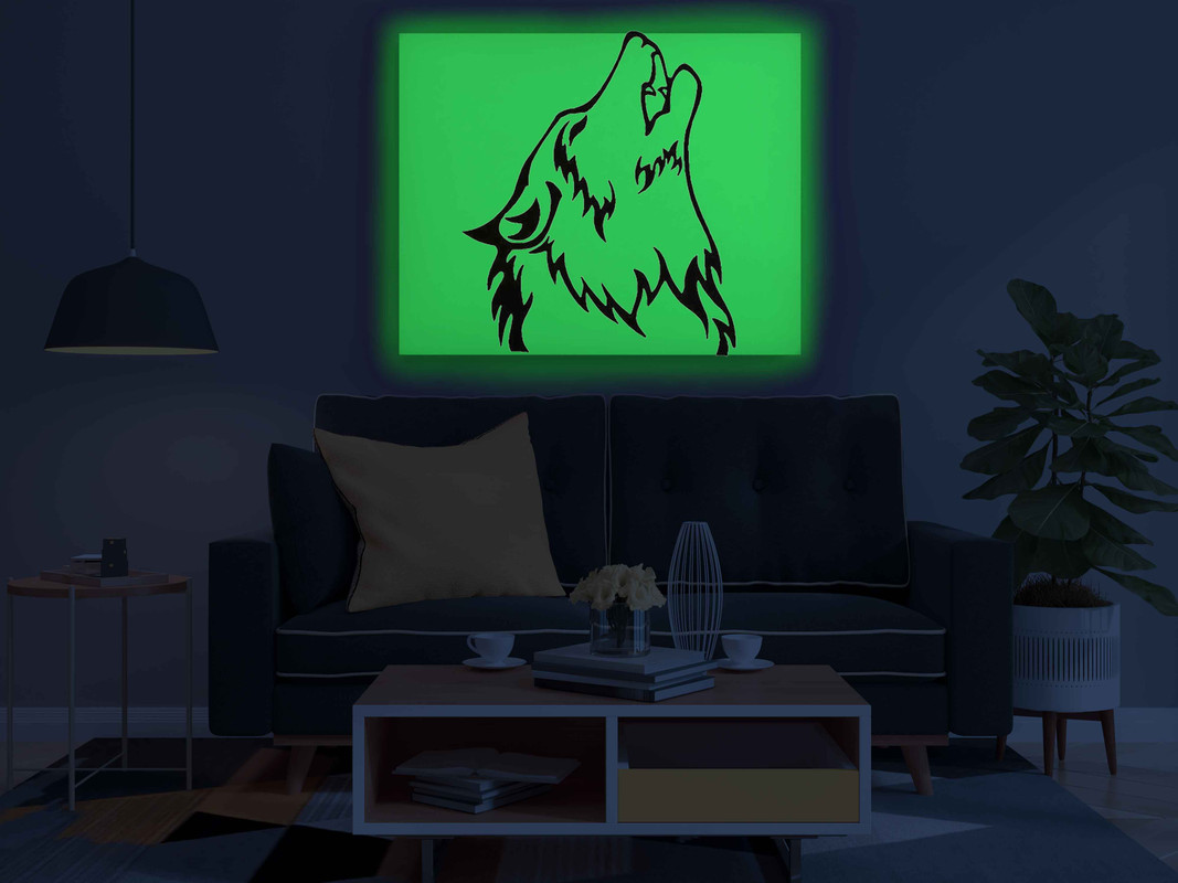 Painting is easy: use the included black paint for dark outlines and apply your choice of glow-in-the-dark paint (Blue, Cyan, or Green) on the white areas. In the day, it appears as a striking tribal sketch. At night, the wolf glows softly, adding magic and strength to your space.