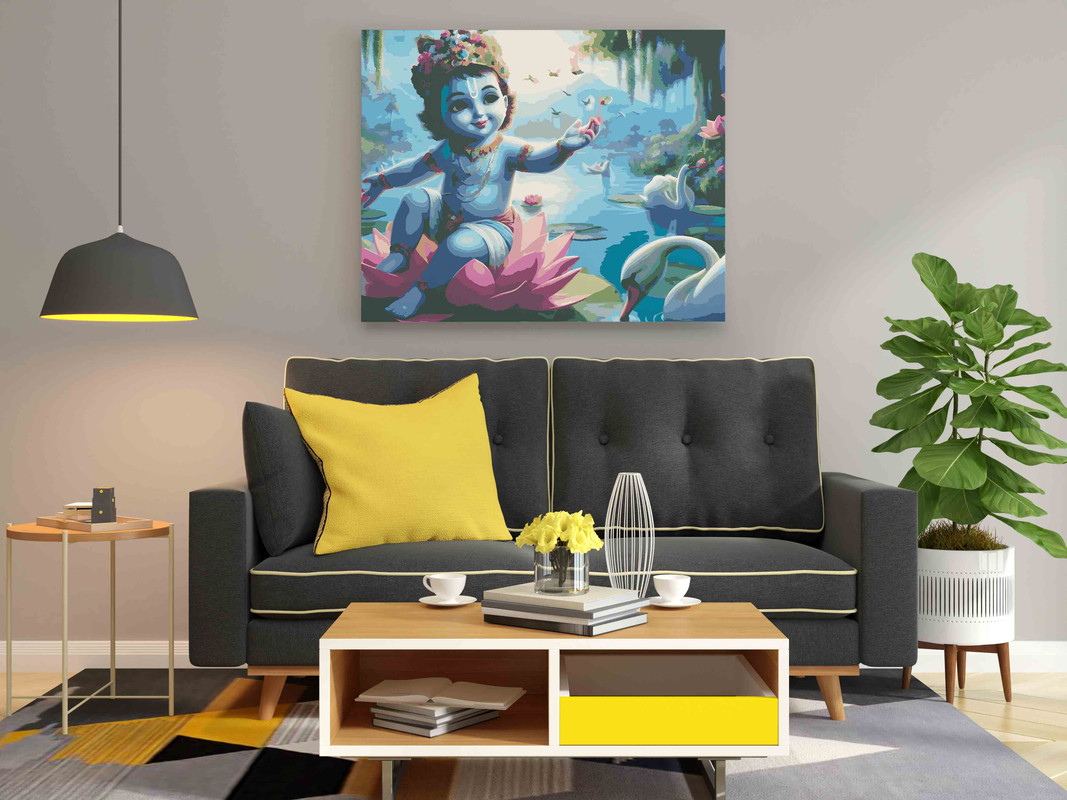 Delight in the innocence and beauty of Baby Krishna with this stunning Paint by Numbers kit, featuring the divine child seated on a blooming lotus in a serene water garden. Surrounded by swans, lotuses, and gentle light, Krishnaβs joyful expression and intricate jewelry add a magical charm to this spiritual artwork. The vibrant colors and playful setting make it ideal for family spaces and devotional corners.