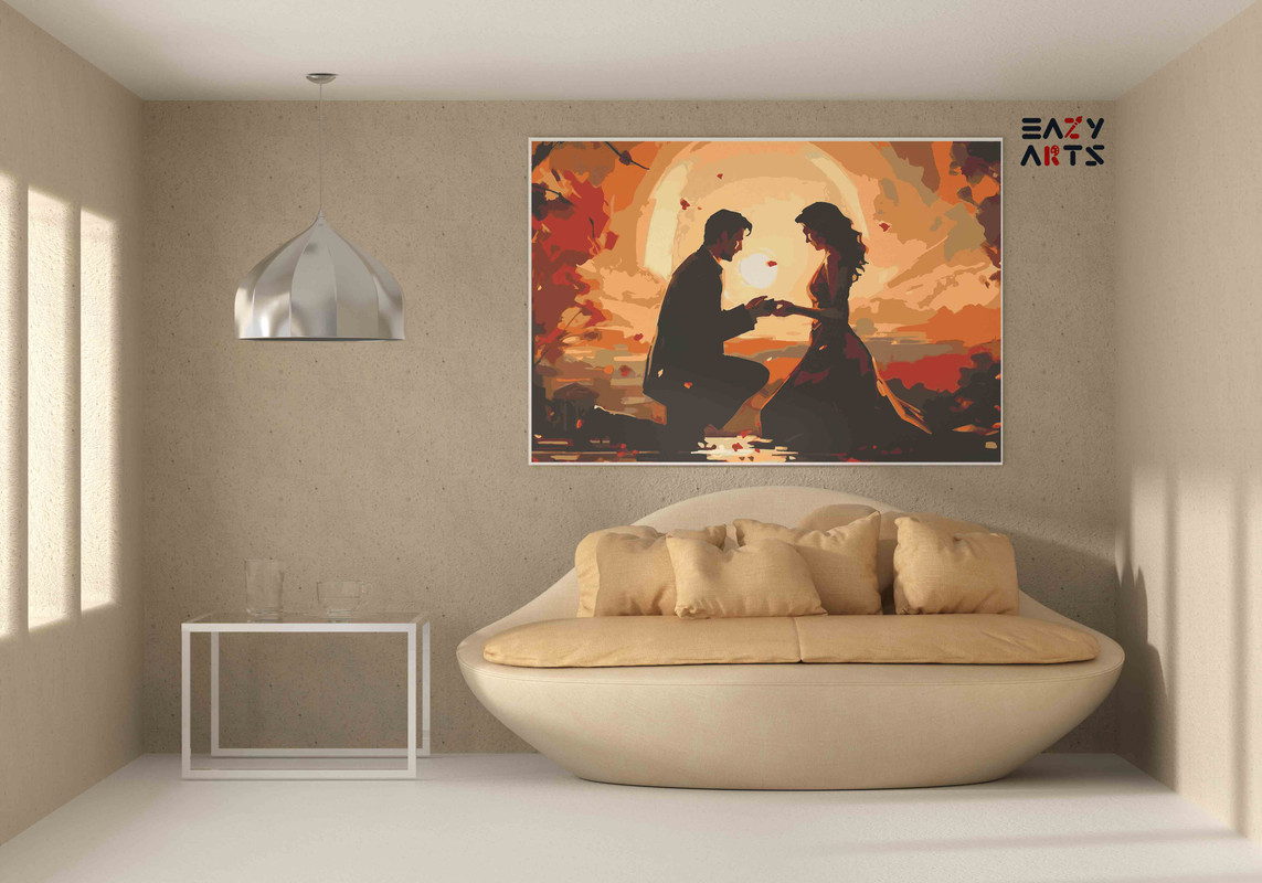Capture the magic of love and commitment with our Romantic Sunset Proposal Paint by Numbers Kit. This enchanting scene depicts a heartfelt moment between a couple as the man kneels in proposal, bathed in the glow of a dreamy sunset. Surrounded by falling petals and soft golden light, this artwork evokes warmth, affection, and everlasting love.