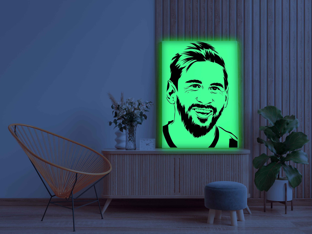 Use the black paint to fill in the sketch lines, and glow-in-the-dark paint (Blue, Cyan, or Green) for the rest. During the day, enjoy a clean, bold portrait of Messi. At night, watch his smile light up your spaceβ€”literally.