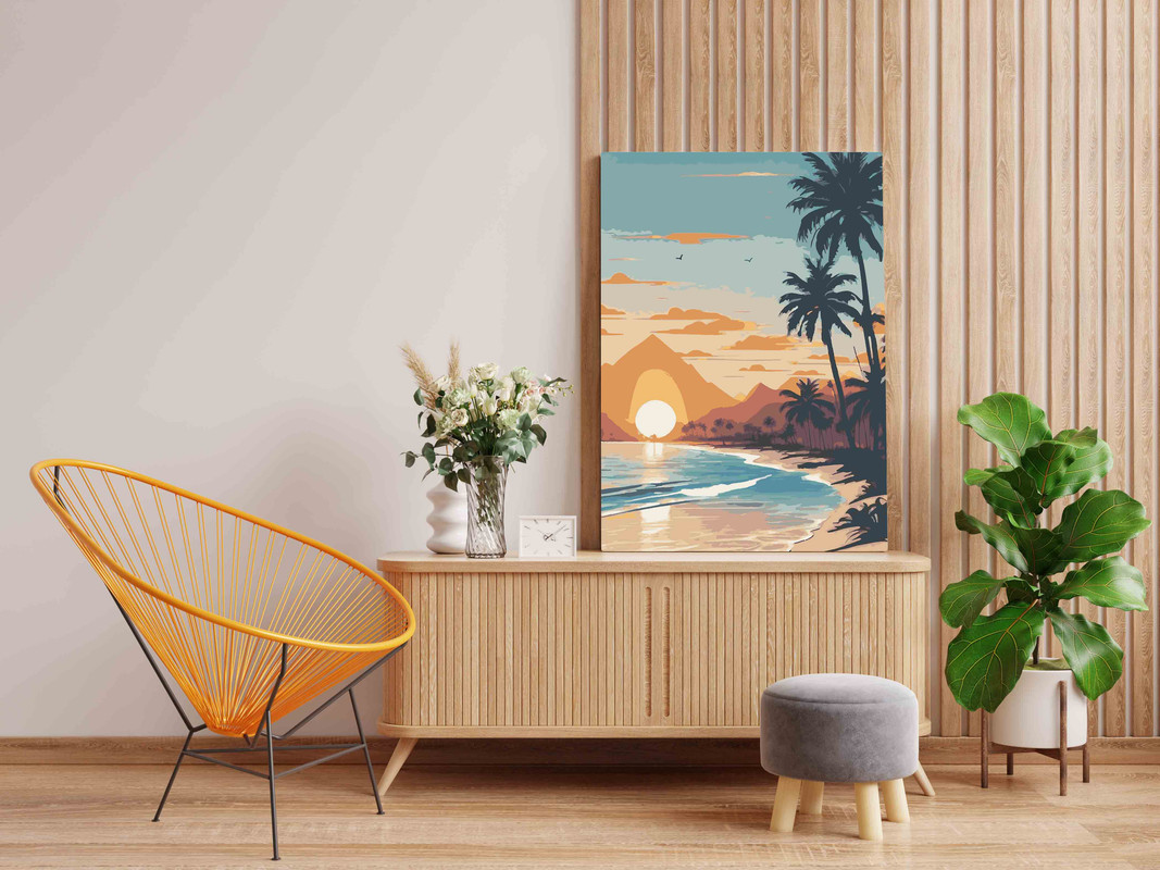 Escape to a tranquil sunset paradise with our captivating paint by number kit! This stunning landscape showcases a serene beach scene, featuring silhouettes of palm trees against a vibrant sunset backdrop, with the sun dipping below majestic mountains and gentle waves lapping at the shore. Perfect for beginners, this kit includes everything you need to bring this picturesque moment to life.