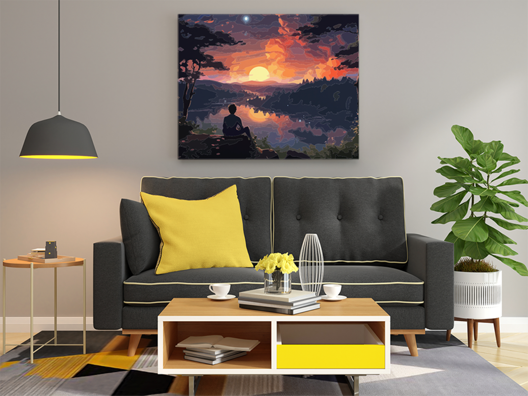 Immerse yourself in the peaceful beauty of a sunset with the Tranquil Sunset Reflection Paint by Numbers Kit. This serene scene captures a lone figure watching the sun as it sets over a calm lake, with the warm colors of dusk reflecting off the water. Deep oranges, purples, and pinks fill the sky, creating a tranquil atmosphere perfect for relaxation and artistic expression. Whether you’re an experienced artist or new to painting, this kit offers an easy and enjoyable way to create a stunning landscape that will bring warmth and calm to any room. A perfect gift for sunset lovers or anyone who enjoys quiet moments in nature.