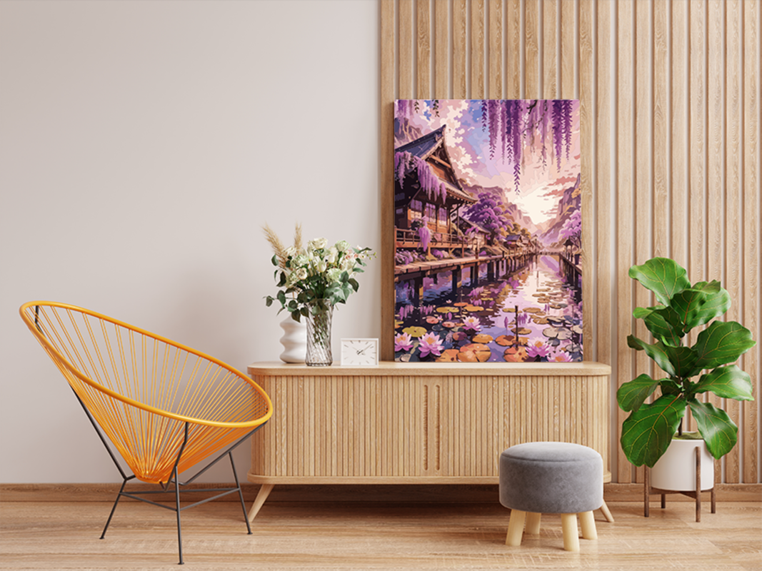 Step into a world of tranquility with the Wisteria Dream Water Garden paint by numbers kit. This stunning artwork features a picturesque house surrounded by cascading wisteria vines and a calm lily-covered pond reflecting the soft hues of sunset. Ideal for relaxation and perfect for both beginners and experienced painters, this kit allows you to bring the calming beauty of a water garden into your home. Create a masterpiece that radiates peace, harmony, and natural beauty.